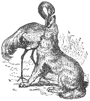 A Wolf, having a bone stuck in his throat, hired a Crane, for a large sum, to put her head into his throat and draw out the bone. When the Crane had extracted the bone, and demanded the promised payment, the Wolf, grinning and grinding his teeth, exclaimed: “Why, you have surely already a sufficient recompense, in having been permitted to draw out your head in safety from the mouth and jaws of a Wolf.”