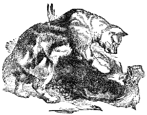 A Cat caught a Cock, and took counsel with himself how he might find a reasonable excuse for eating him. He accused him as being a nuisance to men, by crowing in the night time, and not permitting them to sleep. The Cock defended himself by saying that he did this for the benefit of men, that they might rise betimes, for their labors. The Cat replied: “Although you abound in specious apologies, I shall not remain supperless;” and he made a meal of him.